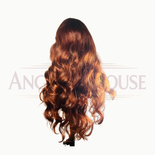 Perruque ondulée de 26 pouces, couleur brun roux lumineux. HD lace 13×6 et densité 250 % pour un rendu naturel, confortable et facile à coiffer.