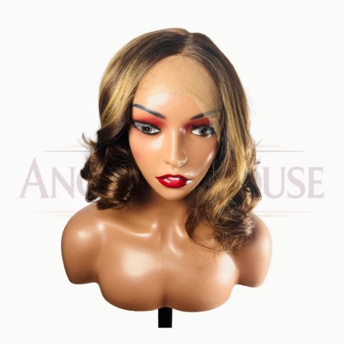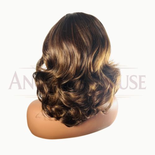 Perruque ondulée de 18 pouces, coupe courte jusqu’aux épaules, couleur brun doré. HD lace 13×6 pour un rendu naturel et facile à coiffer.