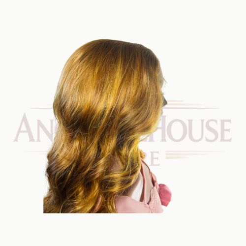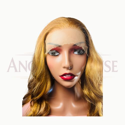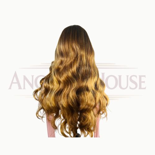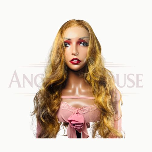 Chevelure ondulée de 32 pouces, teinte dorée lumineuse. HD lace 13×4 pour un rendu naturel et confortable, facile à coiffer et entretenir.